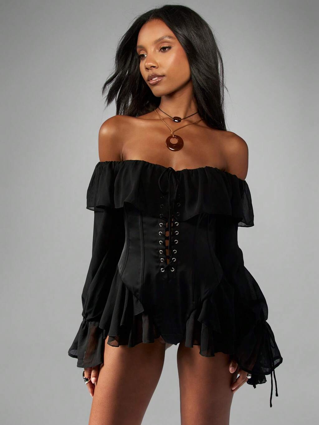 MISSGUIDED Off Shoulder Milkmaid Bodysuit Corset Style Long Bell Sleeve Ruffle Trim Festival Renaissance Costume Gothic Formal Occasion Outfit Autumn Winter