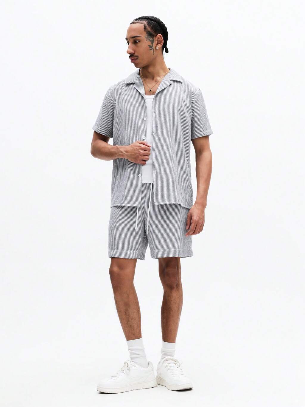 SUMWON Men Striped Short Sleeve Button Up Shirt And Matching Drawstring Shorts Summer Co-Ord Set