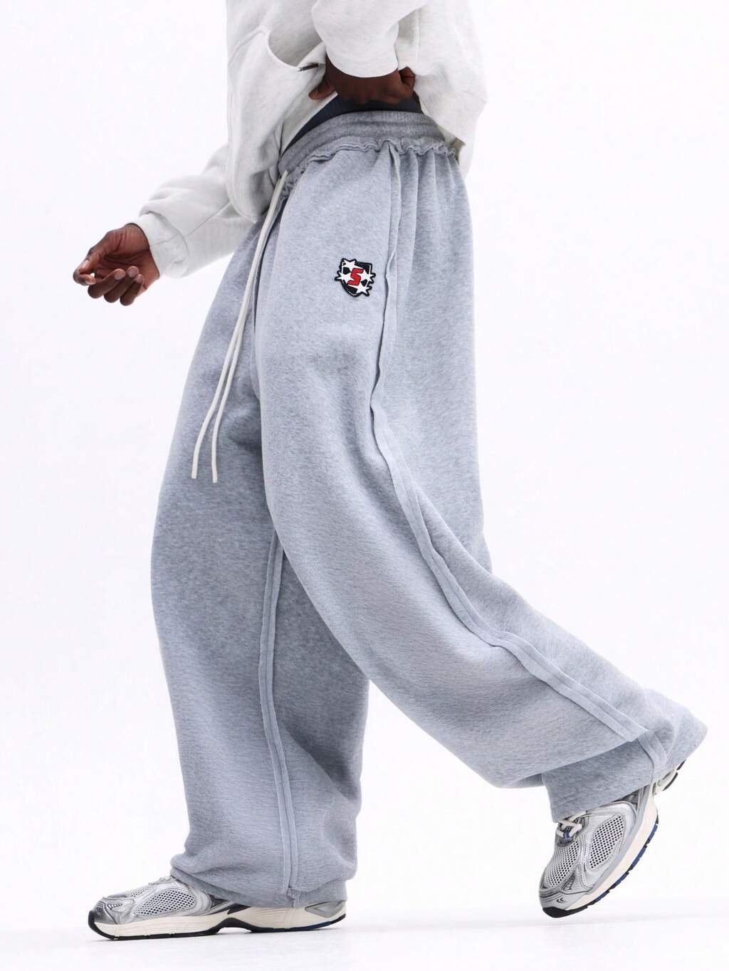 SUMWON Folded Wide Fit Sweatpants With Logo Embroidery Relaxed Casual Drawstring Fleece Pants Winter Comfort Loungewear Plain
