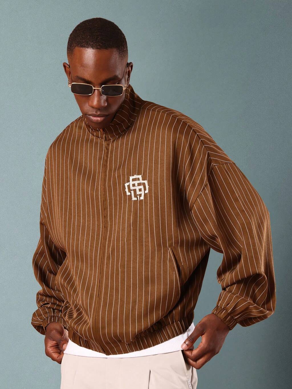 SUMWON Oversized High Neck Bomber Jacket Pinstripe Pattern Retro Style Winter Fall Streetwear Classic Collection Urban Fashion Zip Up Outerwear