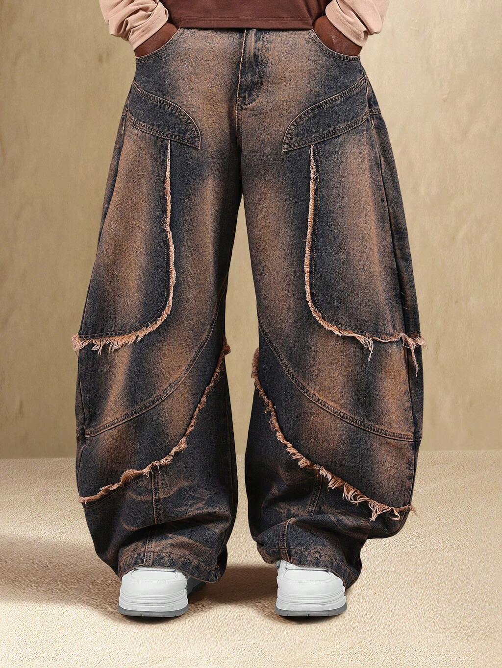 SUMWON Distressed Wide Leg Y2K Jeans With Raw Edge Seams Festival Alternative Streetwear Baggy Denim Pants With Frayed Seams Patchwork Detail Plain