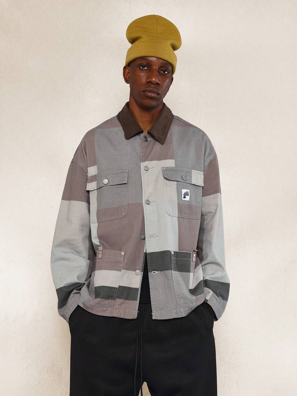 SUMWON Patchwork Workwear Utility Denim Jacket Modern Color Block Design Contrast Panel Construction Heavy Duty Chest Pockets Fall Winter Casual Outerwear