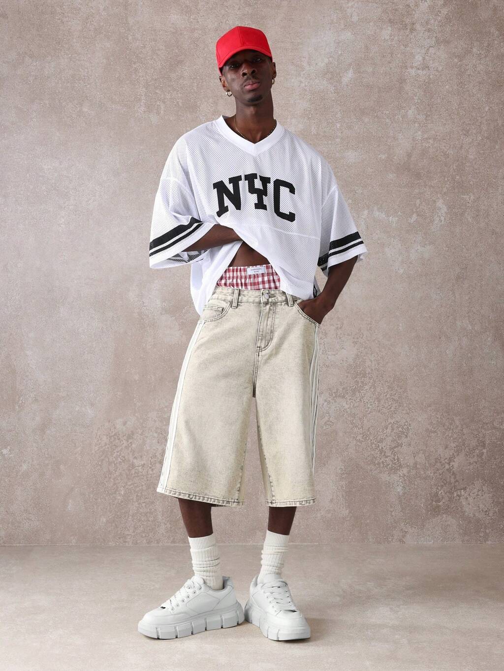 SUMWON Designer Gothic Letter Print Denim Shorts High Fashion Cut Off Wide Leg Shorts Retro Streetwear Summer Festival Bermuda Raw Edge Distressed Baggy Shorts Unisex Denim Bottoms Urban Hip Hop Style