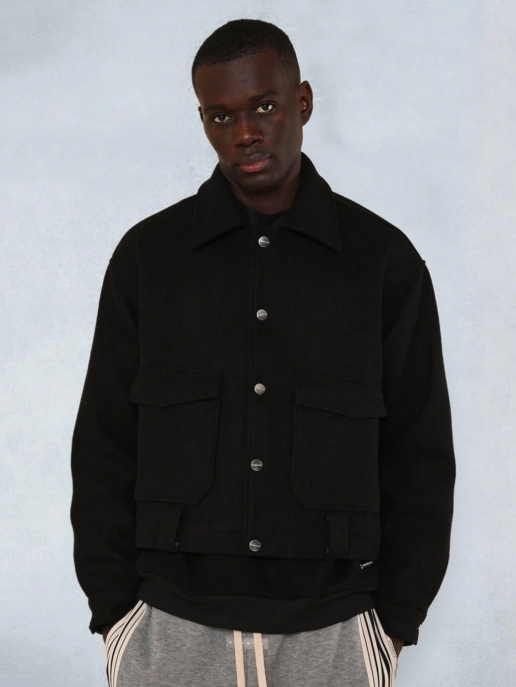 SUMWON Structured Utility Jacket Wool Blend Boxy Silhouette Winter Fall Outerwear With Patch Pockets Metallic Button Front Closure Oversized Style