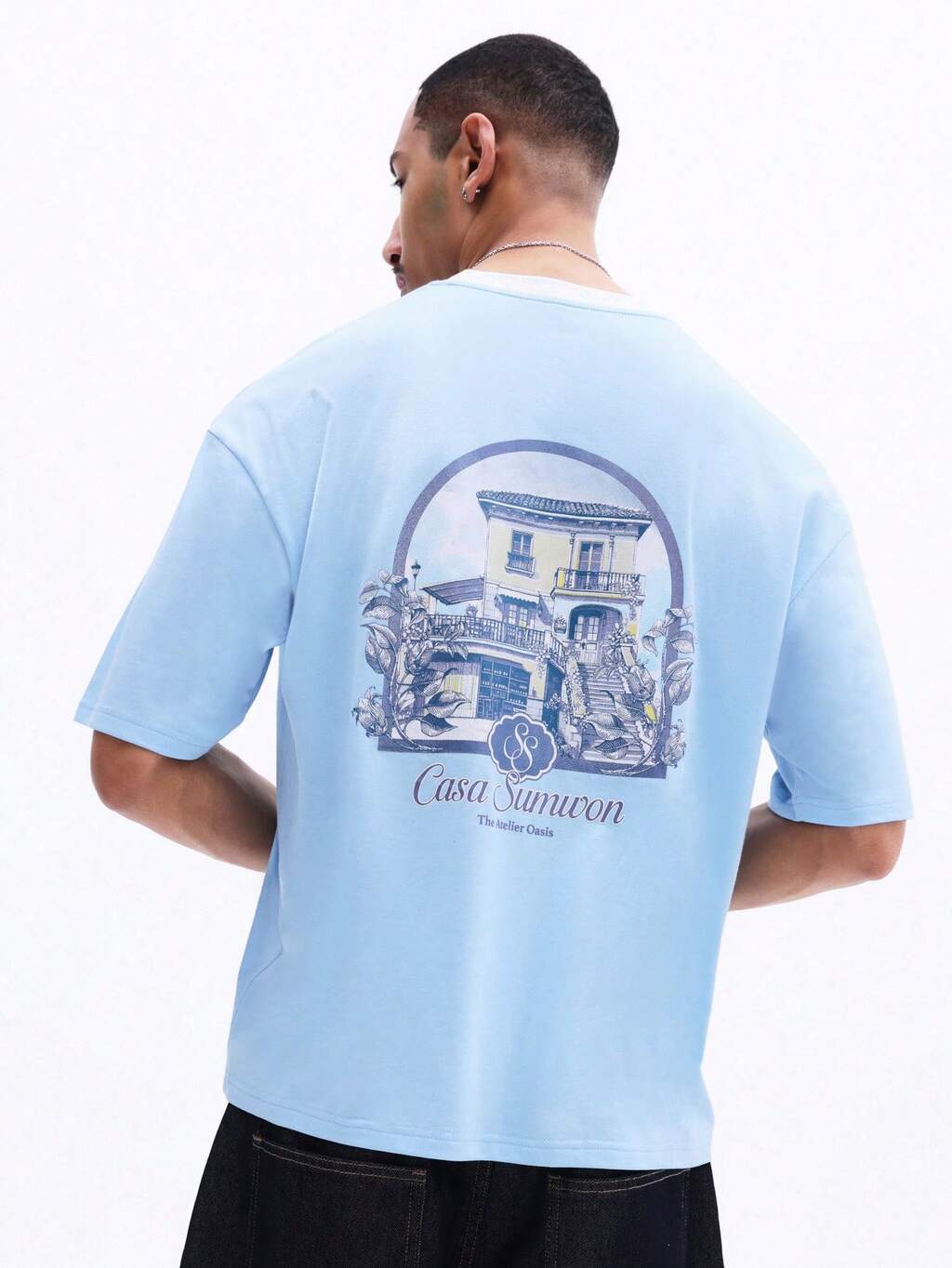SUMWON Casa Boxy Fit Light Blue Short Sleeve Crew Neck T-Shirt With Architectural Back Graphic Print And Contrast White Collar Casual Streetwear Top