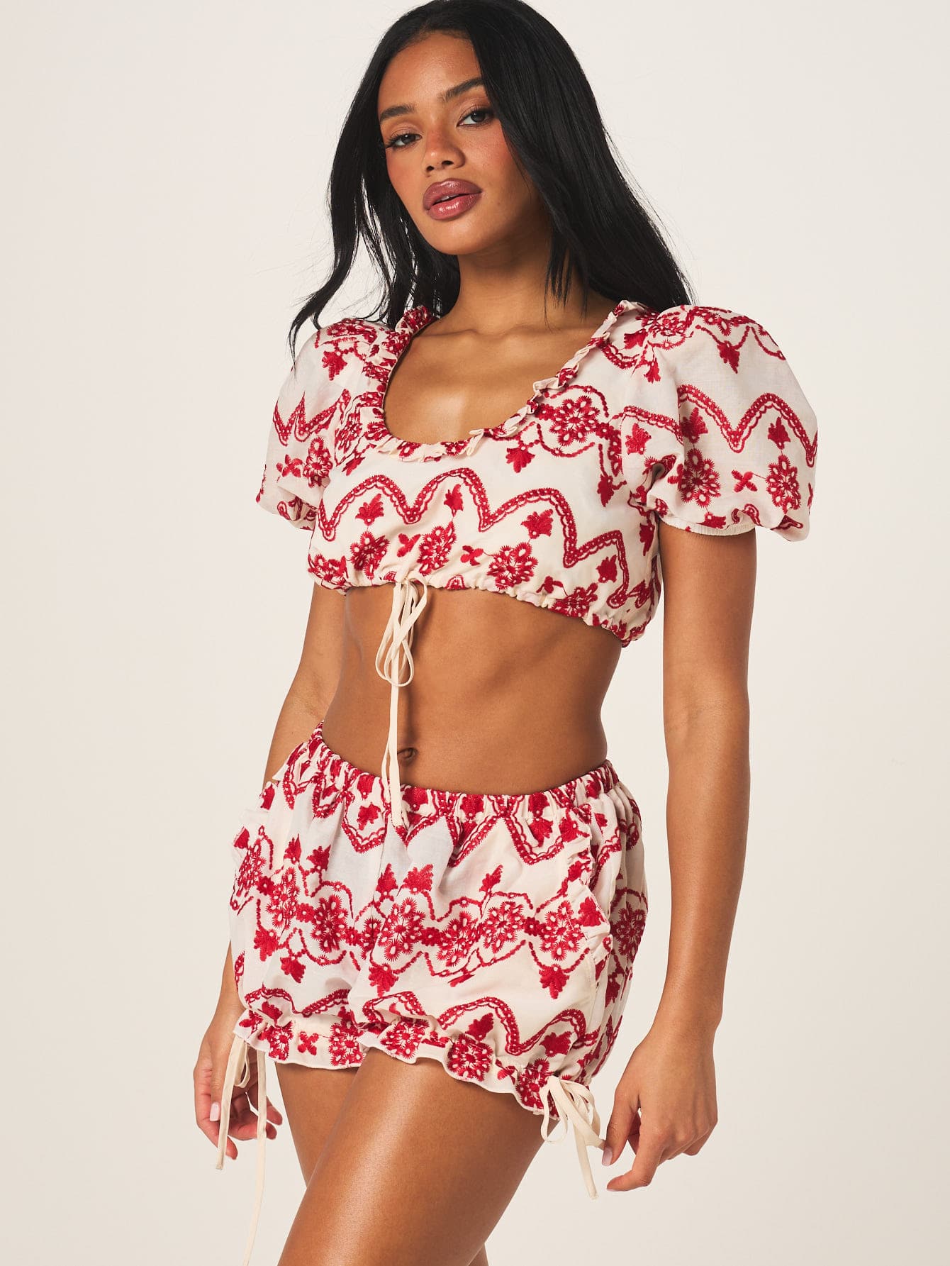 MISSGUIDED Red White Embroidery Anglaise Crop Top With Puff Ball Sleeves Square Neck Summer Festival Boho Floral Design Feminine Blouse