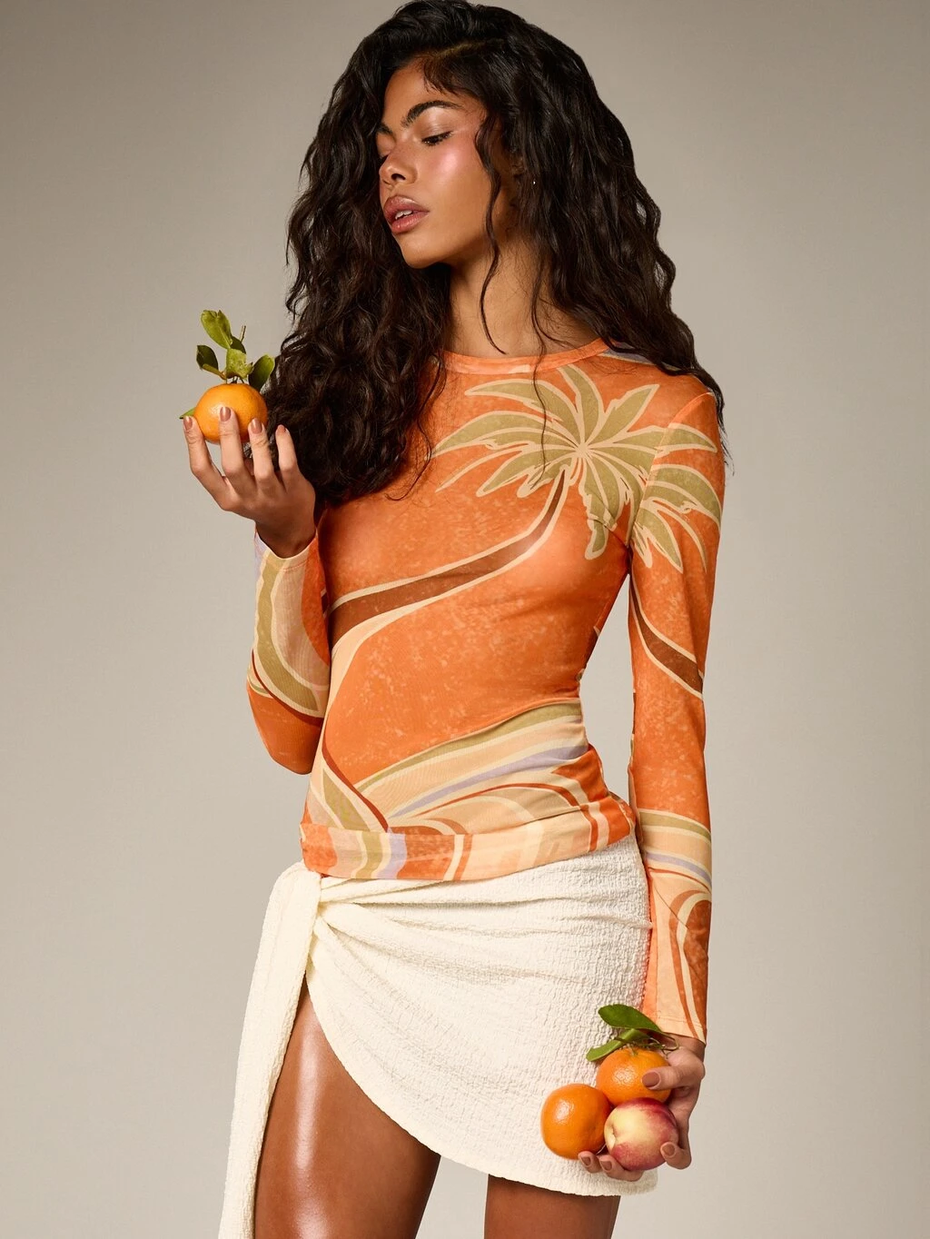 AiiRZ Women's Orange Tropical Palm Tree Print Mesh Long Sleeve Crew Neck Top With Swirl Pattern Design