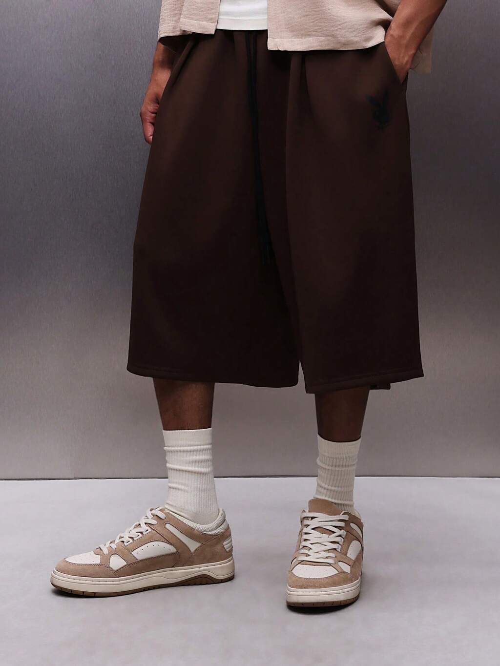 PLAYBOY X SUMWON Men's Grey Jersey Pull On Wide Leg Jorts With Drawstring Waist And Logo Bunny Detail