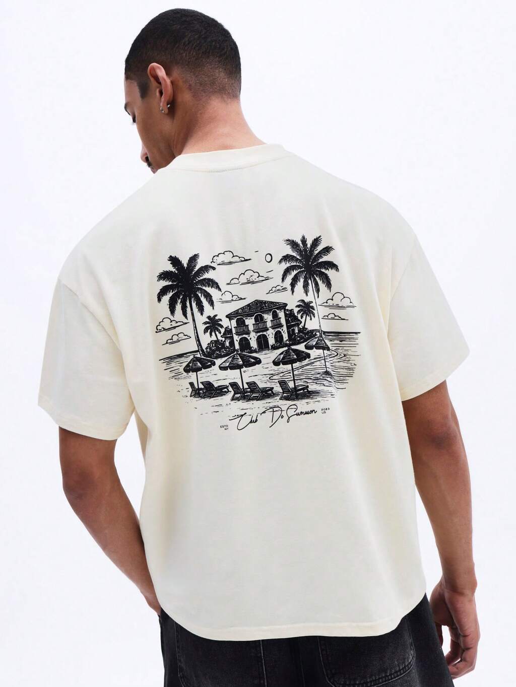 SUMWON Herren Creme Boxy Fit T-Shirt mit Club Muster Kurzarm Casual Sommer T-Shirt Vintage Stil Grafik T-Shirt