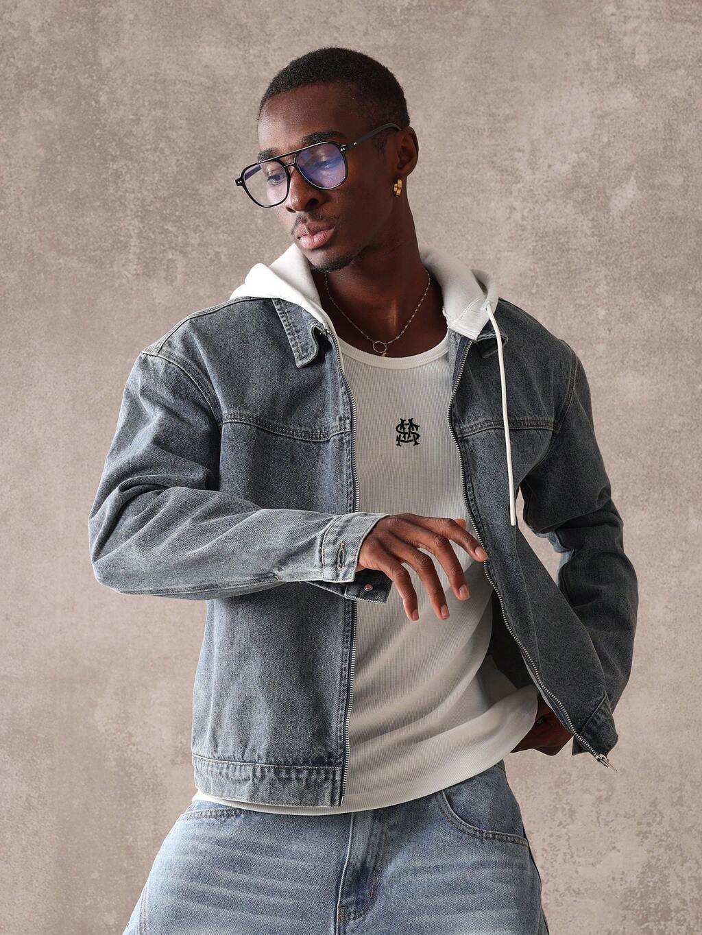 SUMWON Klassische Jeans Trucker Jacke mit Kapuzen-Einsatz, used-Stil Winteroberbekleidung, Straßenmode-Layering-Look, urbaner Modestil