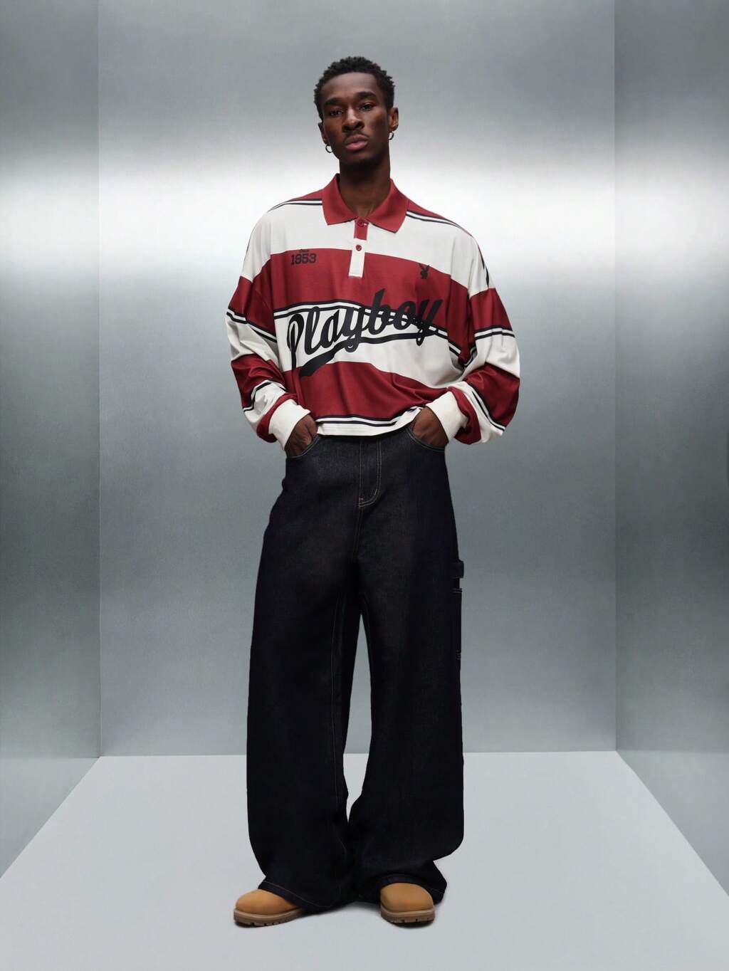 PLAYBOY X SUMWON Tailliertes Vintage Rugby gestreiftes Poloshirt mit langen Ärmeln und klassischem Kragen-Knopfleiste