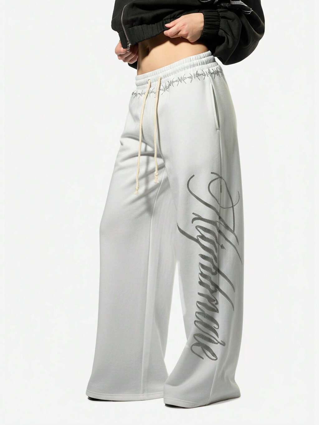 SUMWON Weiße weite Jogginghose mit auffälligem Rückenprint, hoher Bund, locker geschnitten, Gummibund, Streetstyle Loungewear Herbst Winter Mode Statement Text Muster
