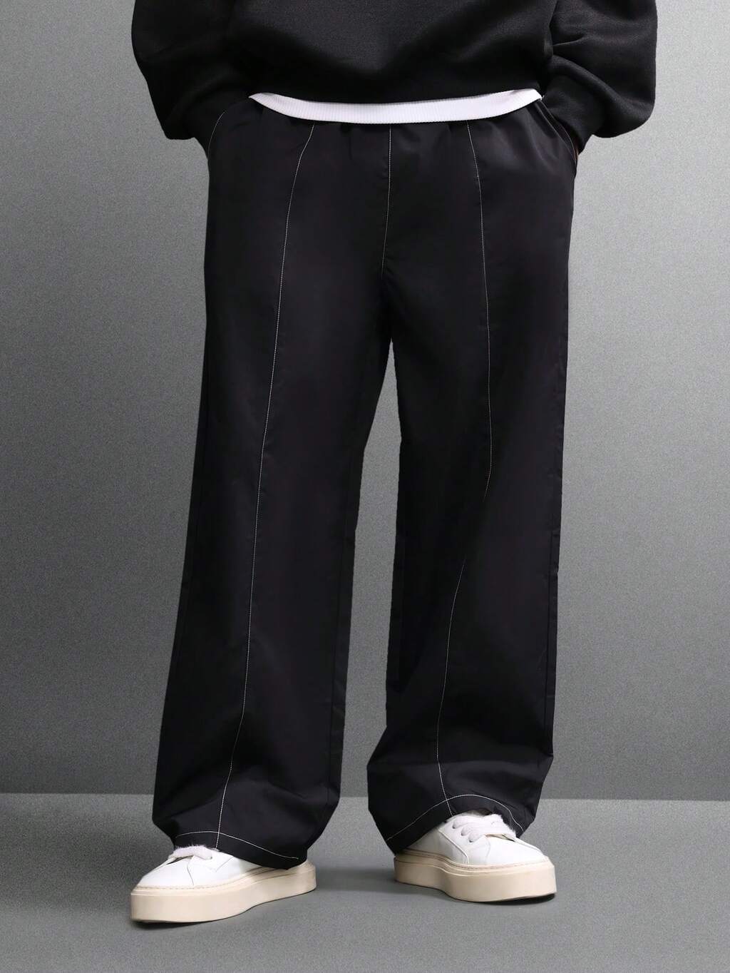 SUMWON Pantalones anchos de pierna ancha con costuras de contraste, de corte holgado, con pespuntes blancos, de estilo casual y urbano, de talle alto, para otoño e invierno