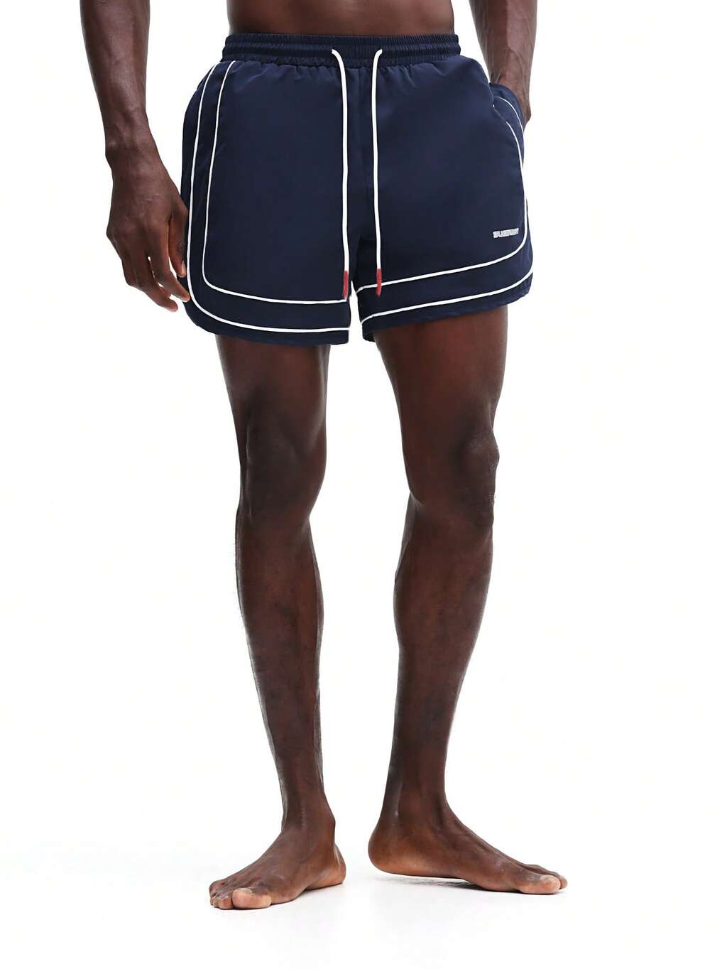 SUMWON Pantalones cortos de natación para hombre con dobladillo curvo en azul marino con ribete blanco contrastante, pantalones de playa de verano con cintura elástica