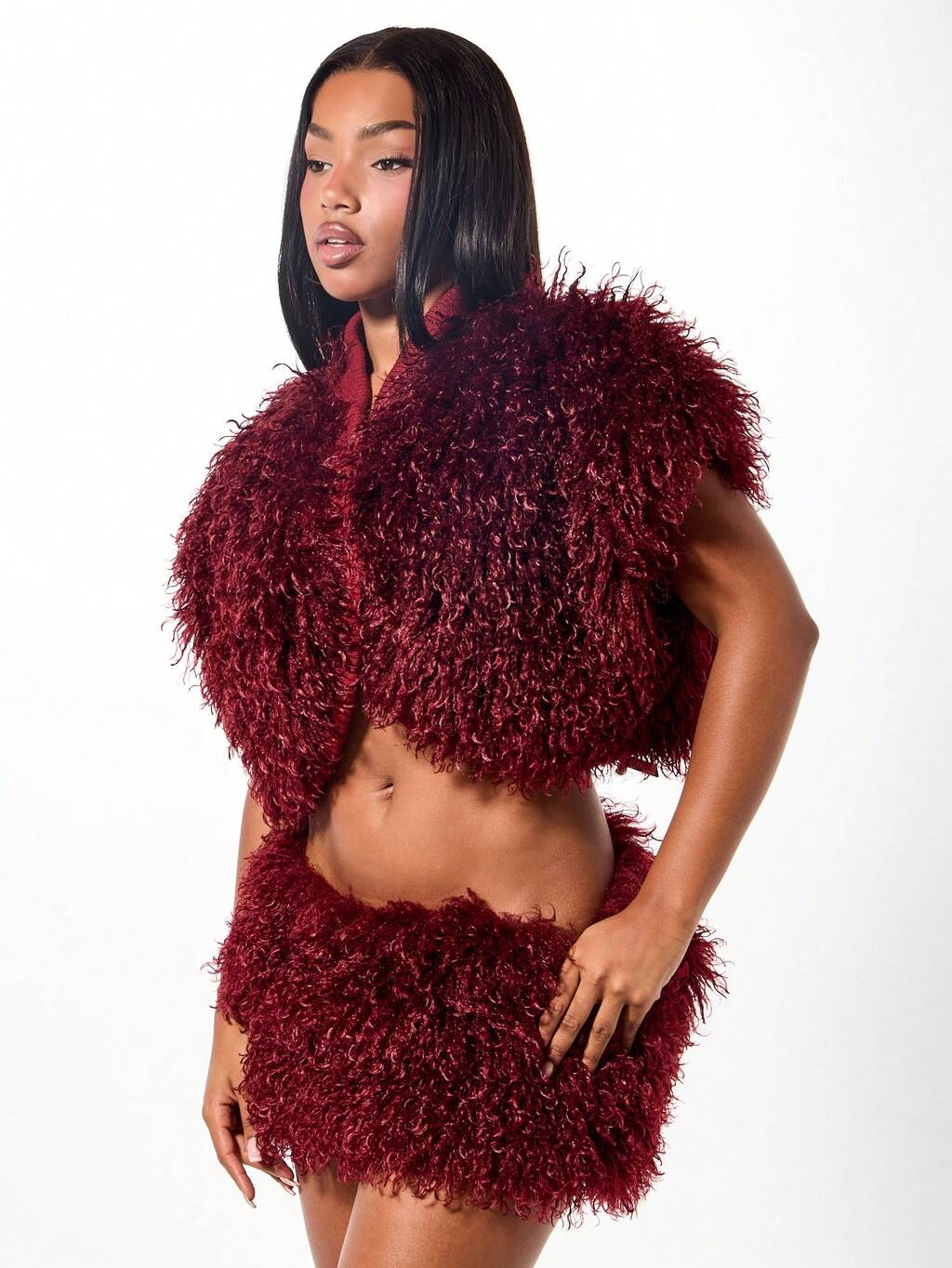 SUMWON Chaleco sin mangas de piel sintética de lujo para mujer, chaqueta de abrigo de invierno de borgoña con plumón, prenda de moda