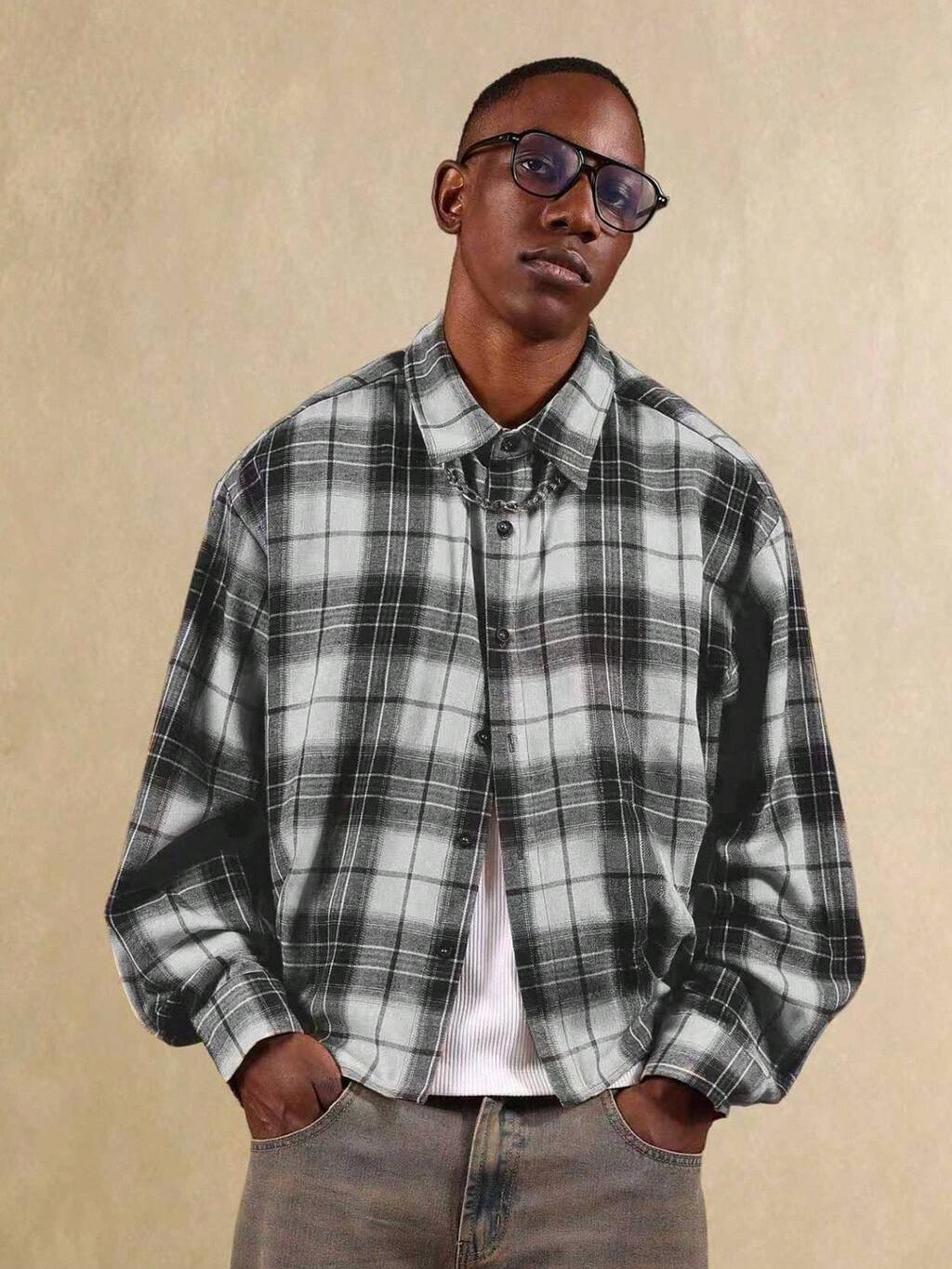 SUMWON Chemise à carreaux à manches longues et boutons, coupe décontractée, épaules tombantes, style casual de printemps en coton, style de rue , chemise flanelle, basiques modernes