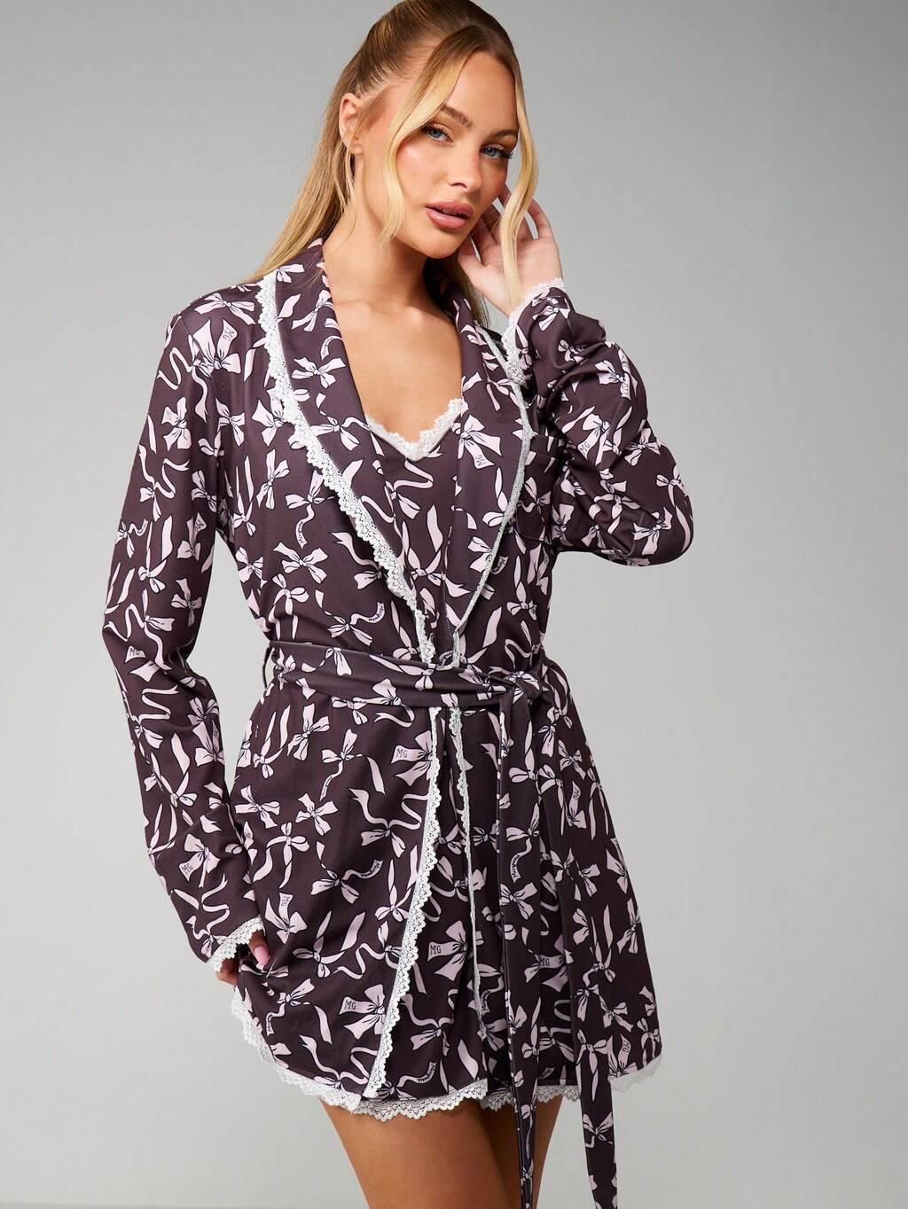MISSGUIDED Robe de chambre en satin à manches longues avec imprimé floral, garniture en dentelle et ceinture nouée
