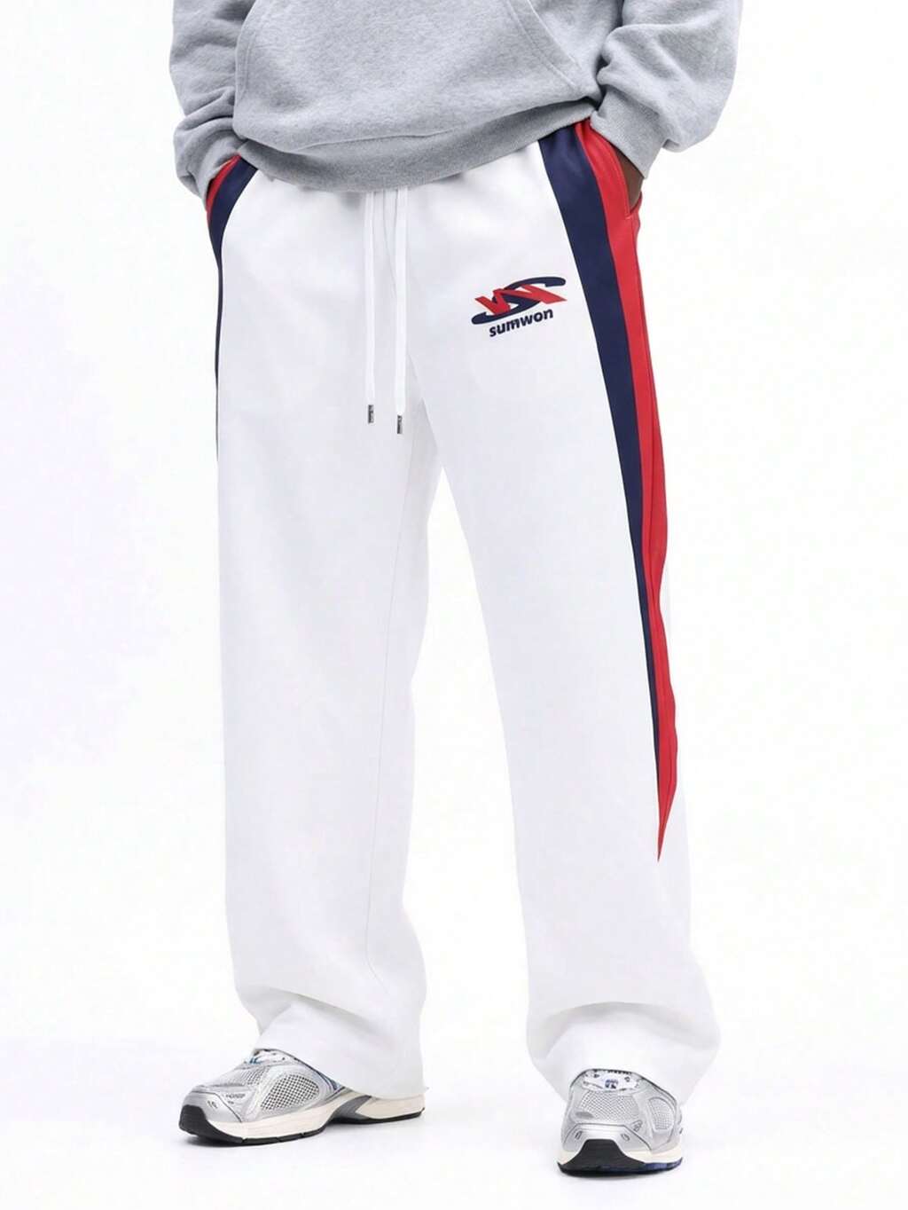 SUMWON ゆったりフィットスウェットパンツ、トーンオントーンのサイドパネル、ホワイトのパイピングディテール、リラックスしたドローストリング付きウエスト、カジュアルラウンジパンツ、無地