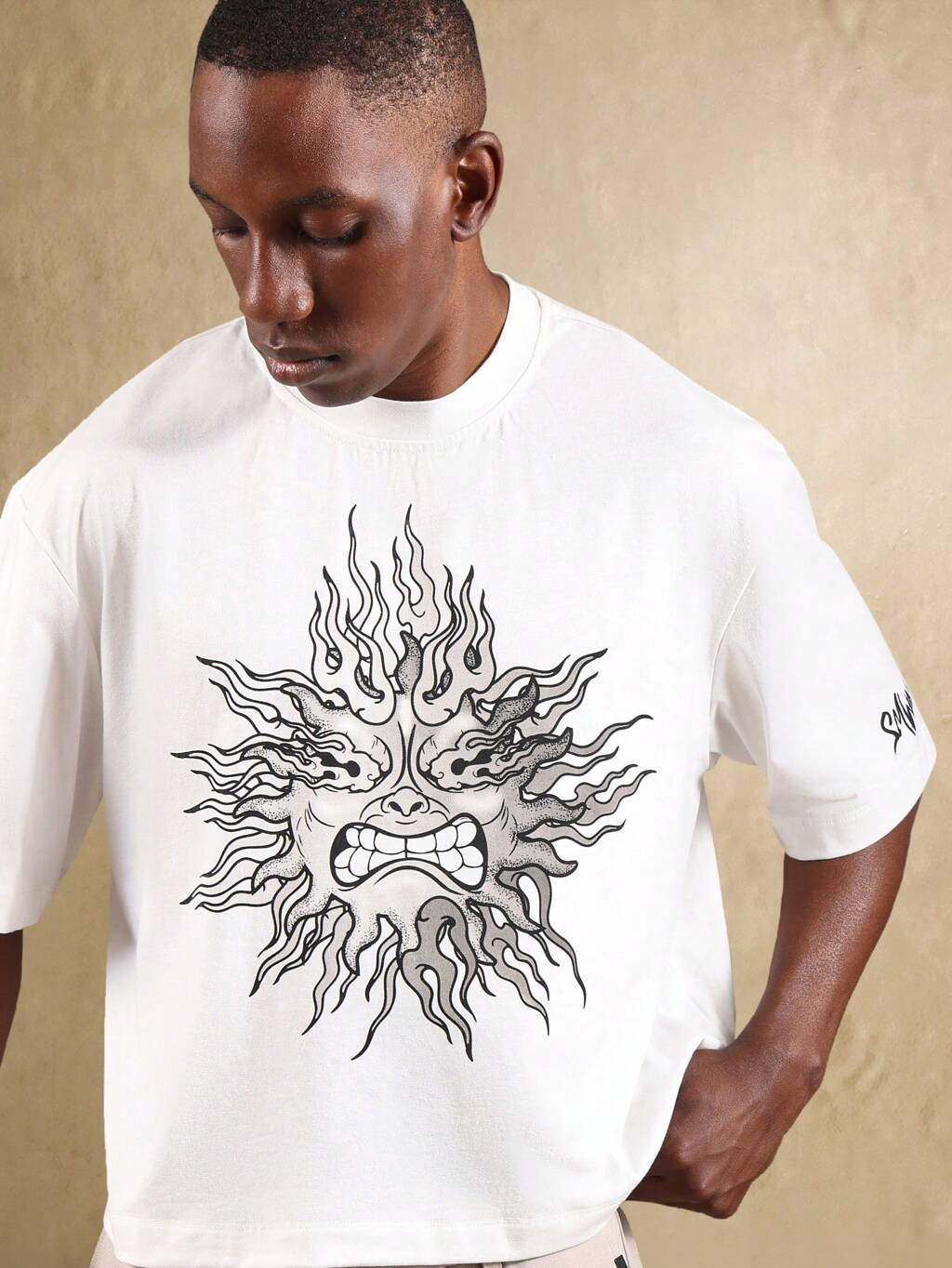 SUMWON Eclipsis Solaris Studioオーバーサイズtシャツ、太陽と月と星の宇宙柄、ストリートウェア、フェスティバル、夏