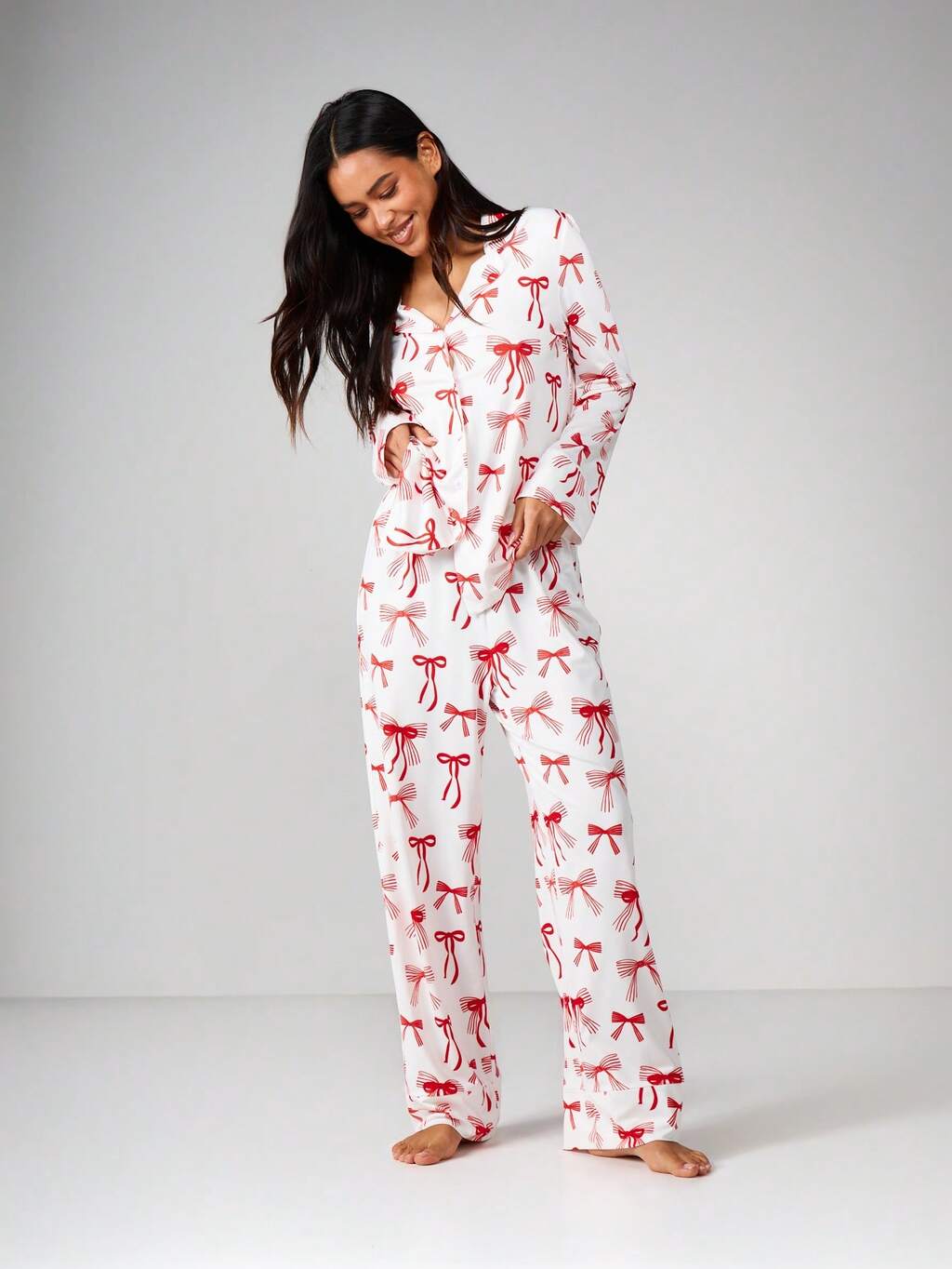 MISSGUIDED 女性用リボン柄パジャマセット 長袖 ボタン前開き ラウンジウェア クリスマスホリデー快適ナイトウェア