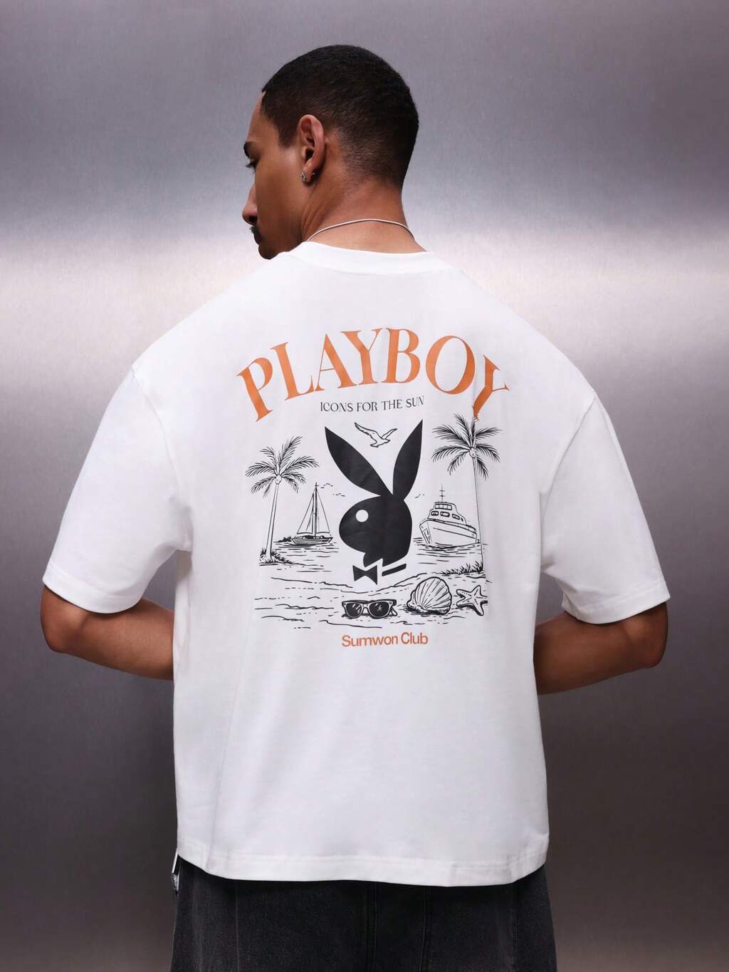 PLAYBOY X SUMWON 크롭 핏 남성 여름 클럽 그래픽 프린트 반팔 크루넥 레귤러 핏 휴가 티셔츠 가슴 및 등 디자인