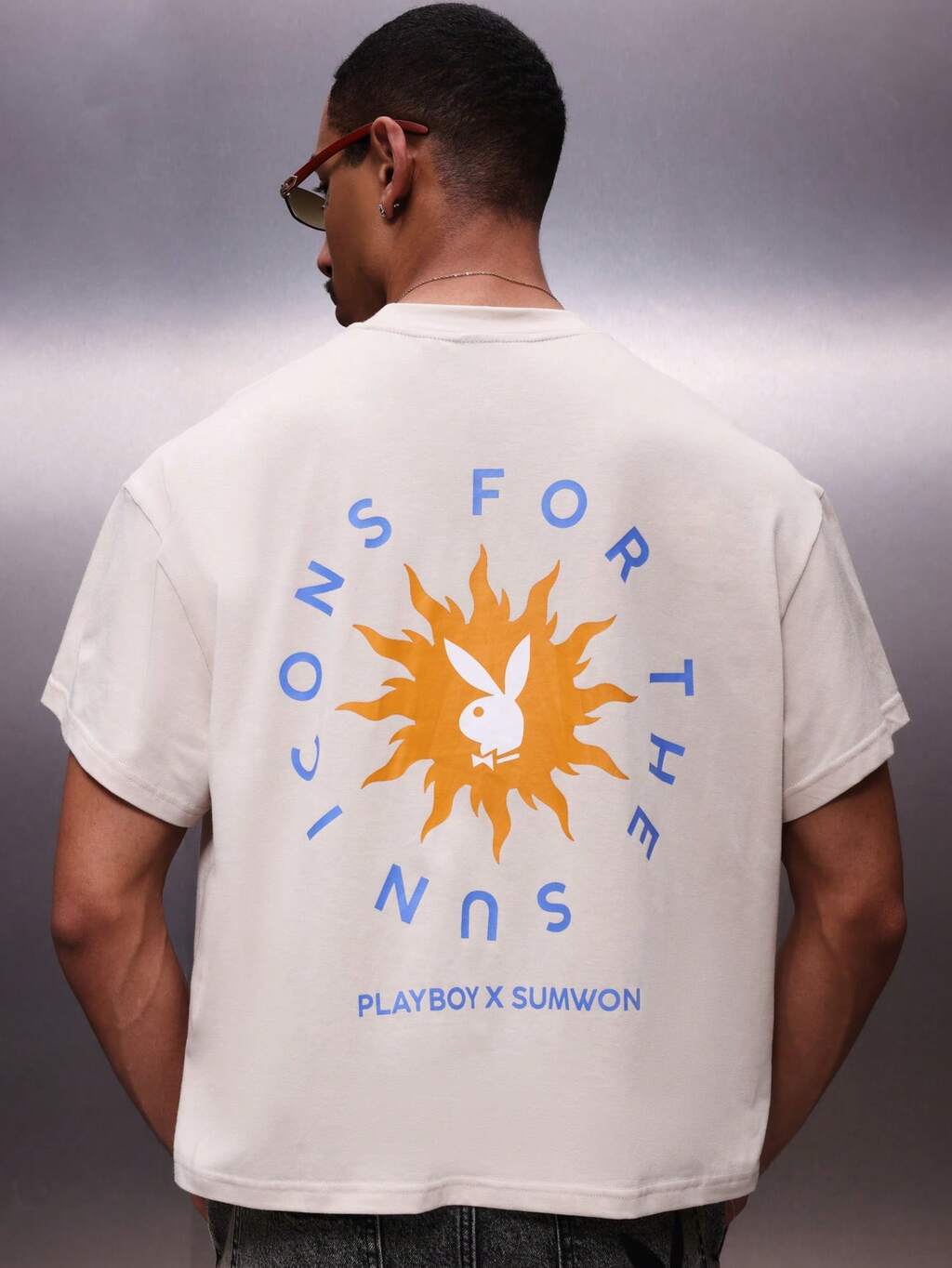 PLAYBOY X SUMWON 남성용 크롭 핏 크루넥 반팔 티셔츠, 대형 뒷면 토끼 로고 프린트 캐주얼 티 모던 릴렉스 핏