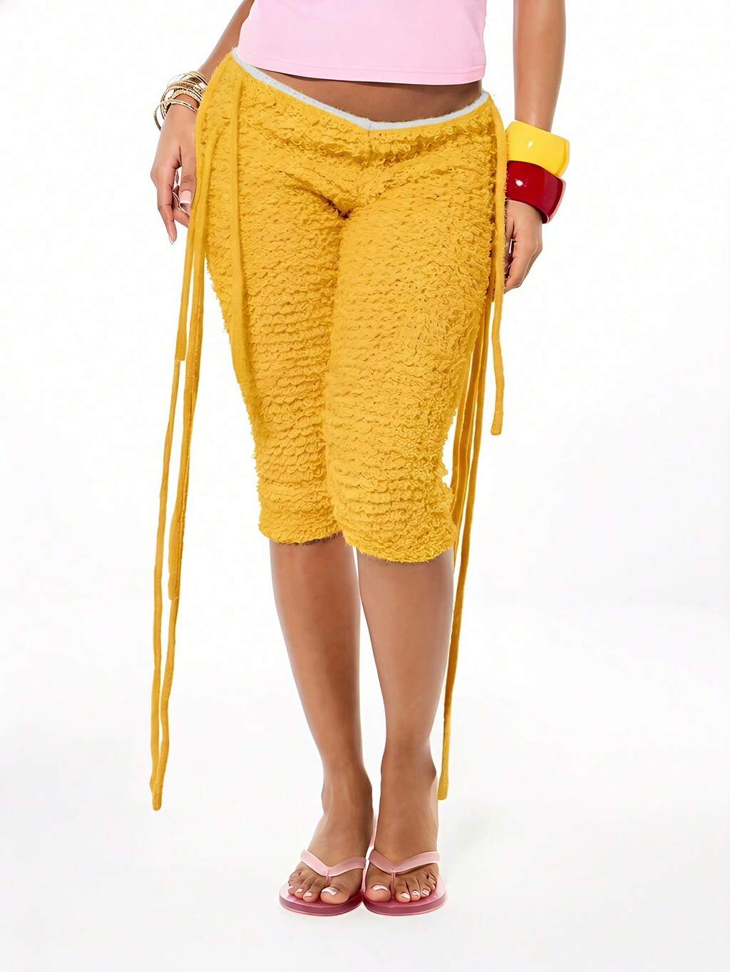 SUMWON Koraloworóżowe, szydełkowe, letnie, swobodne spodnie typu bermudy z aplikacją w kształcie żółtego kwiatu i ściągaczem
