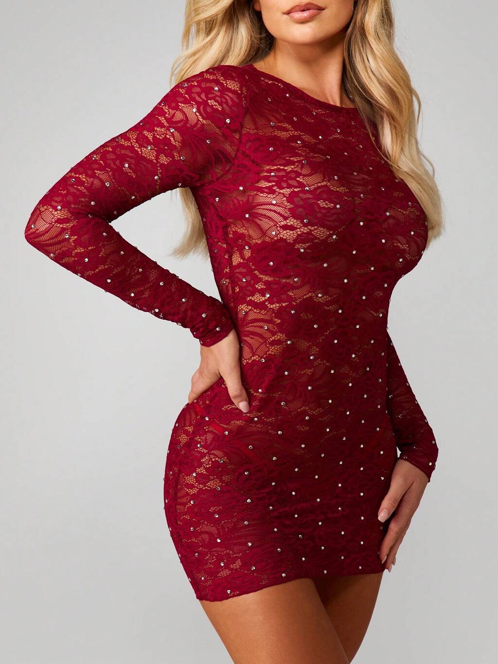 MISSGUIDED Burgundowa koronkowa mini sukienka z długim rękawem i kryształkami, dopasowana, na imprezę, wieczór i oficjalne przyjęcie