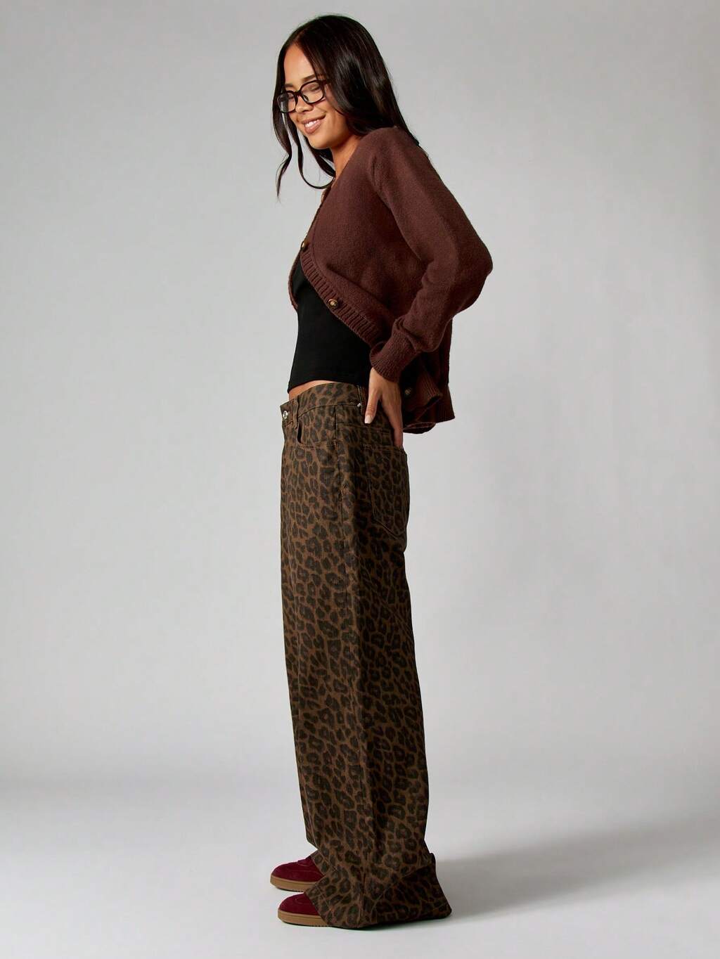 MISSGUIDED Jeansy palazzo z szerokimi nogawkami i wysokim stanem z nadrukiem w panterkę, bawełniane, damskie, casualowe, boho, festiwalowe, streetwear