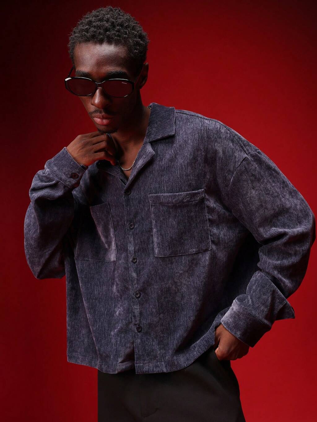 Camisa Casual de Trabalho Simples com Gola Revere, Mangas Compridas, Ajuste Curto, Botões na Frente e Textura de Veludo da SUMWON