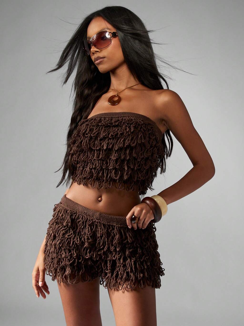 MISSGUIDED Conjunto de Coordenado Tricô Detalhado com Franja, Cropped Bandeau, Mini Saia, Estilo Boho Ocidental, Roupa de Festa de Clube, Conjunto de Duas Peças